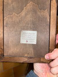 Le immagini, realizzate con stampa e colorazione interamente a mano, provengono da un laboratorio artigianale di Firenze, come indicato dall’etichetta sul retro “Decoration of wood and colouring of print completely by hand – Made in Florence, Italy”.