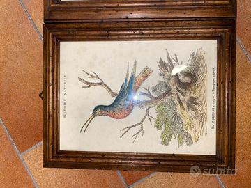 Coppia di eleganti stampe naturalistiche ispirate alle tavole ottocentesche di zoologia, raffiguranti uccelli esotici (“Le Grimpeur noir et jaune” e “Le Colibri rouge à longue queue”).