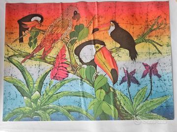 Vendo due stampe su tessuto di scene tropicali, oggetti comprati direttamente in Brasile a Rio de Janeiro: ideali per essere incorniciati per realizzarci un quadro o come rivestimento esterno di un cuscino. Colori molto brillanti. Ottimo stato di conservazione poichè mai esposti ed ancora con confezione originale. Dimensioni: 39,5x28 cm ca.