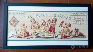 Presento una coppia di stampe vintage pubblicitarie di bambini una dentro la vasca da bagno l'altra che giocano con profumi e sapone entrambe adatte ad arredare con stile liberty entrambe in cornice misura 40x20 con colori vivaci e dettagli raffinati