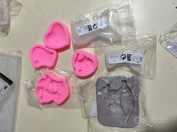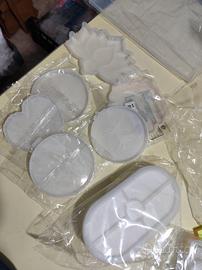 Circa 30 pezzi , stampi per resina - scacchiera 7 pezzi - maniglie - pettine - cuore con supporto - set sottobicchiere con espositore - set sottobicchiere sagomati - vassoietto ovale - mongolfiera - 1 coda sirena grande + 1 piccola - coppia angeli - cavalluccio a dondolo - cuore stile ricamo - pupazzo di neve - guanto Babbo Natale - gatto - orso - bambolina (vasetto)