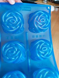 Stampo per dolci "PAVONI" con 6 cavità a forma di rosa, colore blu. Questo stampo permette di creare delle dolcissime rose ed è ideale sia per il forno che per l'abbattitore. Resiste a temperature da -40°C a +280°C. Le dimensioni dello stampo sono 30 x 17 x H 4cm.