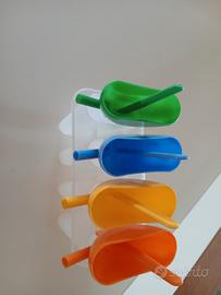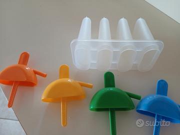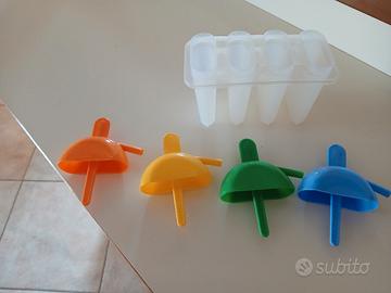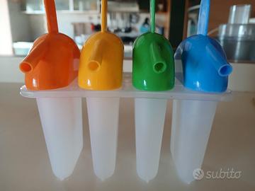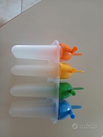 stampo per 4 ghiaccioli con beccuccio da cui bere anche il ghiacciolo fresco o i succhi di frutta, con pratica presa come da foto e colori differenti per i vari gusti, come nuovo, usato pochissimo, senza difetti.
