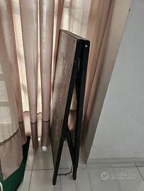 vendo questo stand , è stato fatto a mano , il materiale è legno ed è totalmente nero con scritte bianche presenti solo su una faccia. Le due facce sono tenute da 2 catenelle , una per lato. Per qualsiasi informazione, domanda o proposta contattarmi in privato