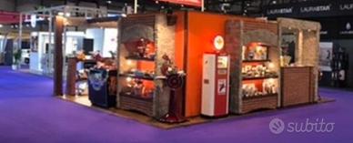Struttura stand completa di mobili componibili con pavimento in legno, pareti di chiusura, banco di vendita, travi in finto legno, travi finta pietra, illuminazione spot, quadro ed impianto elettrico predisposto per l'utilizzo. I materiali di finta pietra e finto legno sono al tatto molto realistici. I ripiani dei mobili sono in legno, il pavimento è costituito da pannelli in legno componibili. Lo stand è componibile in diverse posizioni a ricoprire una superficie massima di 33 mq con possibilità di esecuzione rettangolare, ad L ad angolo aperto e ad angolo chiuso, ad isola. Progettazione effettuata da Studio di Architetti di Torino, materiale di qualità e produzione artigianale valdostana.