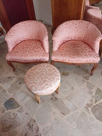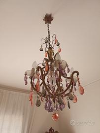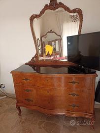 stanza da letto usato in buone condizione con letto e materasso, comodini con vetro in cristallo, cassettiera con stesso vetro e specchio, toilette con specchio e vetro in cristallo, lampadario a gocce colorate fumé in cristallo e applicc da comodino come lampadario, poltroncine e puffo rifoderate.