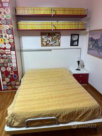 Stanza completa così composta: armadio, 2 armadi laterali a 2 ante da 90 cm a modulo e al centro cabina armadio con cassettiera con quattro cassetti, due mensole e staffa per abiti. Letto una piazza e mezzo da 1,35 mt di larghezza. Due mensole sul letto. Da 1,80 mt ognuna. Scrivania da 2,40 m con due mensole della stessa lunghezza e una piccola da 60 cm. Modulo con cinque mensole laterale all’armadio. mensole ante tutto in legno. Stanza acquistata in negozio di arredamento.