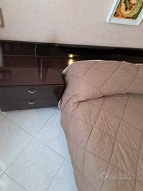 Stanza da letto matrimoniale in ebano scuro e lucido Macassar, stile anni 80, caratterizzato da un elegante design cubico. La struttura geometrica è scandita da cassetti sovrapposti con maniglie in acciaio, per donare luce e un tocco contemporaneo. Lungo il letto è presente una lastra frontale in specchio fumè, così come su un'anta dell'armadio. Vano porta cuscini integrato. Sopra l'angolo toletta, compresa di poltrona, è presente uno specchio rotondo, anch'esso fumè, elemento distintivo che conferisce profondità alla stanza ed un elegante sensazione di sospensione.