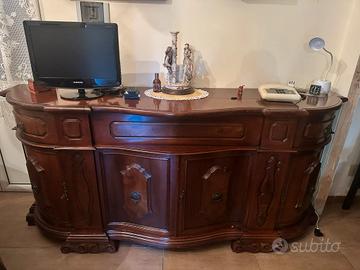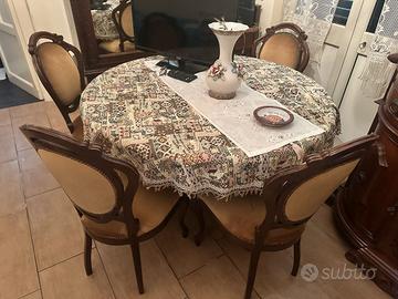 stanza da pranzo completa vetrina + mobile basso + tavolo tondo con 4 sedie. legno massello, colore nice, adatto a rivisitazioni in stile shabby , le sedie hanno ll'imbottitura intatta.
