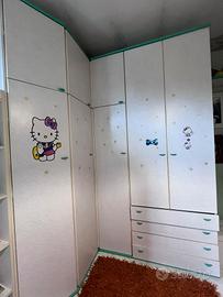 Vendo stanza ottime condizioni, completa di letto a castello in legno massello con due cassetti, libreria con vetrine, comodino, armadio angolare, scrivania, lampadario e tappeto , prezzo affare 300,00 euro