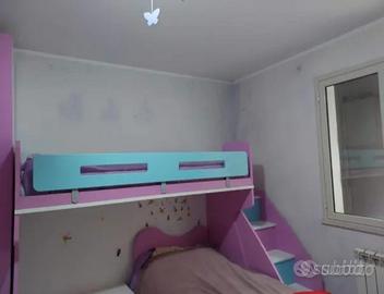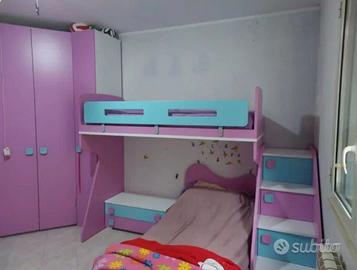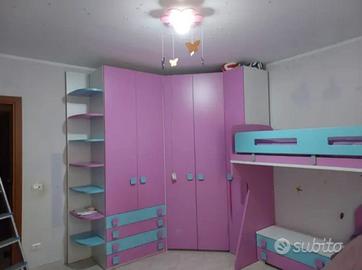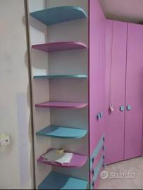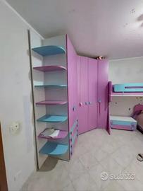Vendo stanzetta completa composta da: armadio 2 ante con 4 cassetti sotto, parete con piccole mensole, grande cabina armadio ad angolo, armadio anta lunga, letto ponte con barra anticaduta, scala per letto ponte con ante porta oggetti, letto indipendente con testata e pediera, largo comodino 2 cassetti, scrivania con cassetti, libreria con mensole e ante chiuse, tre mensole di diversa misura.