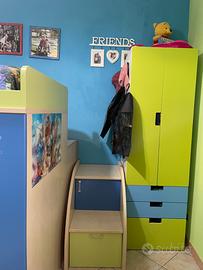 Stanzetta con soppalco, due letti standard, due comodini, 4 settori armadio, cassapanca nel soppalco, scarpiera con cassetti interni negli scalini, scrivania con cassetti, due mensole. Prezzo trattabile.