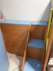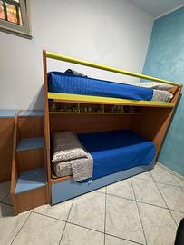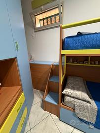 Vendo cameretta completa in ottime condizioni, ideale per bambini o ragazzi. Il set è composto da letto a castello con struttura solida in legno, dotato di scaletta laterale con gradini contenitore e pratici vani portaoggetti integrati. Accanto alla scala sono presenti 2 corridoi coordinati, perfetti per aumentare lo spazio contenitivo e tenere tutto in ordine. Incluso ampio armadio a più ante con cassetti e vano centrale a giorno, ideale per vestiti, libri e oggetti personali. La combinazione di colori azzurro e giallo rende l’ambiente vivace e moderno. Caratteristiche principali: •Letto a castello robusto e sicuro con sponda protettiva •Scaletta con ripiani integrati •2 corridoi laterali aggiuntivi •Armadio spazioso con cassetti e vano a giorno •Ottima capienza e funzionalità •Condizioni molto buone Ideale per ottimizzare gli spazi in una cameretta mantenendo ordine e stile. Disponibile per visione. Contattami per maggiori informazioni.