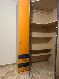 Vendo stanza composta da letto a castello costituita da due letti singoli, armadio a ponte e cabina armadio. Misure letto con armadio a ponte: 2,5 m Misure armadio; h 125 cm profondità 58 cm, larghezza 115 cm angolo con ante blu e 43 cm colonna arancione. Ritiro a Palermo a carico dell’acquirente.