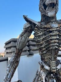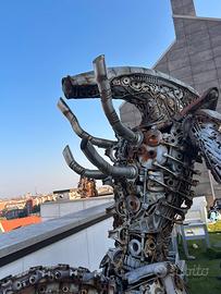 Questa spettacolare scultura è realizzata interamente a mano utilizzando acciaio massiccio e pezzi di ricambio di moto, dando vita a un’opera dallo stile biomeccanico e industriale, perfetta sia come pezzo da collezione che come elemento di arredo scenografico.