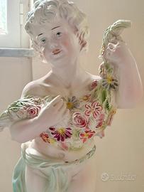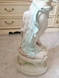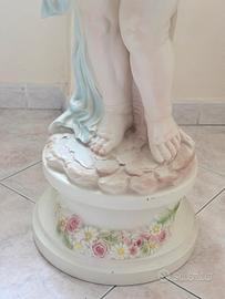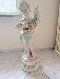 Splendida statua in pregiata ceramica interamente decorata a mano, caratterizzata da una raffinata lavorazione artigianale e colori pastello delicati. La figura rappresenta un giovane fanciullo (o putto) in posa classica, che regge una ricca ghirlanda di fiori multicolore (rose, margherite e anemoni). Il dettaglio dei petali e delle foglie è estremamente curato, tipico della manifattura ceramica di alta qualità (stile Capodimonte o similare). Caratteristiche principali: • Materiale: Ceramica smaltata con finitura opaca/satinata. • Dettagli: Decorazione floreale in rilievo sia sul corpo della statua che sulla base circolare. • Colori: Toni del bianco avorio, rosa antico, azzurro polvere e verde salvia. • Base: Elegante base circolare integrata con fregi floreali. • Stile: Classico, ideale per ingressi, saloni eleganti o per completare arredamenti in stile Shabby Chic o Neoclassico. motivi:cambio arredo
