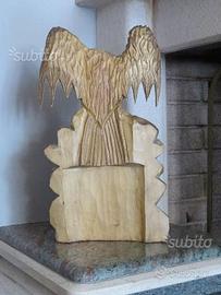 Una splendida scultura in legno di Tiglio fatta a mano, rappresentante un' Aquila su una massa rocciosa che stringe fra i suoi artigli un serpente. Una scultura originale, adatta per abbellire taverne, pub o anche la vostra casa e darle così un gusto rustico e originale.
