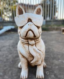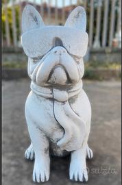 Statua cane bulldog francese con gli occhiali, scultura animale in cemento e pietra.
