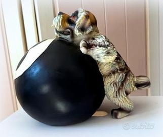 Oggetto raro, forse unico, sicuramente originale, raffigura un cane realistico (credo un terrier), poggiata su una grande palla da biliardo n°8.