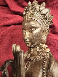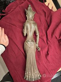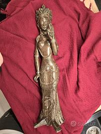 Elegante scultura decorativa raffigurante una figura femminile orientale, un pezzo d'arredo di grande impatto visivo grazie ai suoi 55 cm di altezza. Nonostante le dimensioni importanti, l'oggetto è molto maneggevole grazie alla sua realizzazione in resina moderna (peso circa 1,3 kg), materiale che permette una definizione dei dettagli straordinaria. La figura è caratterizzata da una ricca simbologia floreale: indossa una corona composta da petali e grandi fiori che ornano i lobi, evocando le tradizioni estetiche del sud-est asiatico. La posa delle mani e la serenità del volto trasmettono un'immediata sensazione di pace, rendendola perfetta per chi cerca di creare un angolo Zen o di ispirazione orientale nella propria abitazione. La finitura superficiale è stata studiata per simulare la terracotta antica o la pietra naturale vissuta, con una patina brunita che crea profondità e calore. È un complemento di design estremamente versatile: In un ambiente moderno, funge da pezzo di rottura, aggiungendo un tocco organico e artistico. In un contesto etnico o classico, si integra armoniosamente valorizzando mobili in legno scuro o materiali naturali. Il consiglio per valorizzarla al meglio è posizionarla in un punto dove possa ricevere una luce a LED dedicata, magari dal basso o radente: questo accorgimento mette in risalto le texture del materiale e i dettagli della corona, rendendo la statua quasi viva. L'oggetto è una produzione moderna di ottima fattura. Si segnala, per massima trasparenza, una piccola e impercettibile mancanza sulla punta di uno dei petali della corona (come mostrato nelle foto di dettaglio), che non ne compromette assolutamente l'estetica generale ma anzi contribuisce al fascino dell'effetto "antico". Perfetta sia come acquisto di carattere per la propria casa, sia come regalo di design. Consegna a mano a Reggio Emilia.