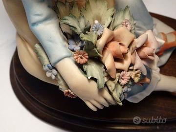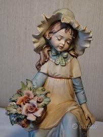 Bellissima statua vintage anni 70/80 in porcellana raffigurante una bambina seduta con un cesto di fiori su di una gamba.