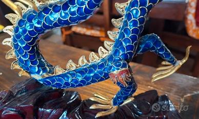 Drago cinese , pezzo unico - Realizzato con tecnica cloisonné, smalto oro e smalto blu. - Base in legno scuro intagliato.