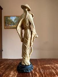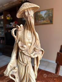 Splendida statua vintage di ispirazione orientale, raffigurante un Anziano Saggio cinese circondato da uccelli (simbolo di armonia e longevità).