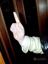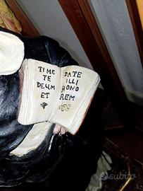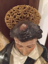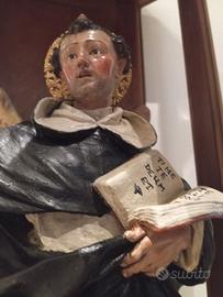 Raro San Vincenzo Ferrer h 63cm in Teca Esagonale - Epoca '800/'900 - Tracce di Fede Popolare Descrizione Generale: Splendida e imponente scultura sacra d'epoca raffigurante San Vincenzo Ferrer, l’"Angelo dell’Apocalisse". L'opera, di raffinata fattura meridionale (scuola napoletana), è databile tra la fine del XIX e l'inizio del XX secolo. Viene presentata nella sua teca esagonale originale in legno pregiato. L'Iconografia e il Dettaglio Storico: Il Santo è rappresentato con i suoi attributi completi: ali dorate, libro con motto biblico e la fiammella dello Spirito Santo. •Nota Storica Importante: L'indice della mano destra presenta un'antica linea di giunzione coerente con l'epoca. Questo dettaglio richiama l'affascinante tradizione popolare legata ai giovani soldati in partenza per la Grande Guerra: era uso comune staccare il dito della statua protettrice per consegnarlo al caro in partenza come "scudo spirituale". Il riattacco del dito, visibile ancora oggi, testimonia con probabilità un felice ritorno e il valore devozionale che questa specifica statua ha ricoperto per la famiglia che la custodiva. Dati Tecnici e Materiali: •Materiale: Legno/cartapesta policroma pesante. Il peso di 12,8 kg garantisce l'autenticità e la solidità dei materiali d'epoca •Dimensioni Statua: Altezza 63 cm | Base 24 x 24 cm. •Dimensioni Teca: Altezza 90 cm | Larghezza max 53 cm | Profondità 36 cm. •Finiture: Base esagonale dorata a foglia con decorazione a finto marmo verde; aureola a raggiera traforata. Stato di Conservazione: Ottimo stato conservativo. La policromia del volto è vivida e intensa. La teca in legno massiccio è integra e protegge perfettamente il simulacro. Per il Collezionista: Un'occasione rara per acquisire non solo un manufatto artistico, ma un pezzo di storia sociale italiana, carico di significato simbolico e fascino antropologico. Spedizione/Ritiro: Data l'importanza e la delicatezza del pezzo (vetri e peso elevato), si predilige il ritiro a mano.