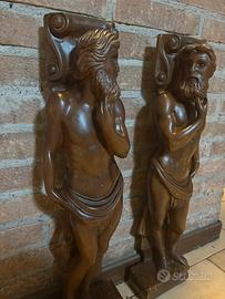 Vendo coppia di statue in legno intagliato da parete, raffiguranti figure maschili in stile classico (atlanti). Lavorazione dettagliata, finitura naturale, perfette come elemento decorativo per ingressi, salotti, taverne o ambienti vintage.