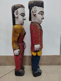 Bellissima coppia di statue Indiane, realizzate in legno massello policromo, provenienti dall'India alte 54 e 52 cm erano utilizzati nel Gangaur Festival che si svolge tra Marzo e Aprile in tutto il Rajasthan , dove l'unione rappresenta la Dea Parvati celebrando l'unione dei 2 come simbolo di felicità coniugale. Ideali in qualsiasi stile di arredamento . Pezzi molto rari e unici. Epoca 1920