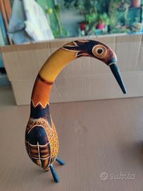 si tratta di una statuetta decorativa a forma di uccello dal collo lungo probabilmente un fenicottero o un'oca stilizzata E realizzata in zucca essiccata intagliata e decorata con olive geometrici il design è slanciate e sinuoso con un becco appuntito e due piccole zampe che fungono da base