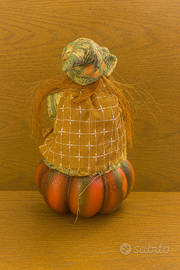 Statuetta raffigurante la Befana, con il suo volto caratteristico e la scopa in mano. Indossa abiti patchwork dai toni autunnali e poggia su una base a forma di zucca decorativa. La particolarità di questa statuetta è che la zucca si illumina grazie a un piccolo vano per batterie, creando un effetto caldo e suggestivo.