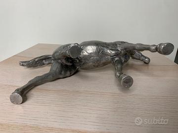 Statuetta in metallo color argento, raffigurante un cavallo in piedi, con la gamba posteriore destra leggermente alzata, in posa di movimento; la testa è allungata in avanti, con orecchie ben dritte e bocca semi aperta, la coda leggermente alzata.