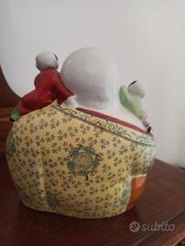🤩 Statuetta Cinese Hotei/Budai Buddha della Felicità con Cinque Bambini - Porcellana Descrizione: Statuetta in porcellana cinese dipinta a mano di grande impatto visivo e forte significato simbolico. Raffigura Hotei (Budai), il "Buddha che ride" o Buddha della Felicità e dell'Abbondanza, circondato da cinque bambini gioiosi. Questa composizione è molto popolare nell'arte cinese ed è un augurio di fortuna, prosperità , ricchezza e abbondanza di discendenti (i cinque bambini simboleggiano i cinque auguri: lunga vita, ricchezza, salute, amore per la virtù, e una morte tranquilla). Materiale: Porcellana con smalti policromi e dettagli dipinti. Dettagli: Molto ben rifinita, con i bambini in pose dinamiche e l'abito di Hotei decorato con motivi floreali e un simbolo del doppio piacere/longevità sul retro. La posa è allegra e vivace. Condizioni: Ottime. Marchio: Presente marchio sul fondo della base (vedi foto). Un pezzo ideale per collezionisti di arte orientale o come oggetto decorativo di buon auspicio per la casa o l'ufficio. prezzo trattabile
