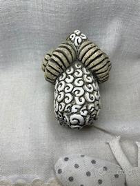 Splendida statuetta raffigurante un ariete, realizzata con grande cura dalla celebre casa manifatturiera Uruguaiana “Artesania Rinconada” perfetta per collezionisti o amanti dell’arredamento originale. Le corna a spirale, dipinte in tonalità grigie con accenti neri, donano profondità e realismo. Il volto marrone con occhio blu intenso e la bocca leggermente aperta conferiscono espressività alla figura. Il corpo è decorato con un motivo a spirale che richiama la lana, in bianco con contorni neri per un effetto tridimensionale sorprendente.