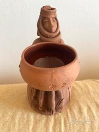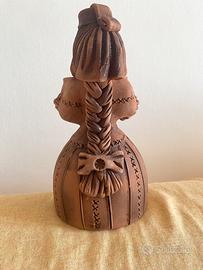 Statuetta di donna in terracotta. Dettagli lavorati su abito, viso e capelli. Porta fra le braccia una ciotola che può essere riempita con una piantina, un cero, potpourri profumato ecc.