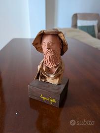 Piccola scultura in terracotta e cartapesta, che raffigura il busto di un uomo con barba e cappello, poggiata su una base di legno con la firma "Eugenio Galli".