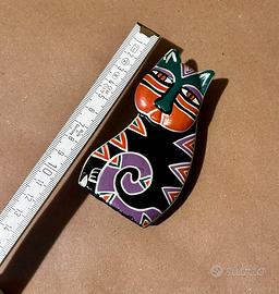 Vendo bellissima statuetta decorativa a forma di gatto, realizzata in legno e interamente dipinta a mano con colori vibranti e motivi geometrici. Un pezzo unico perfetto per dare un tocco pop ed etnico alla casa o per amanti dei gatti.
