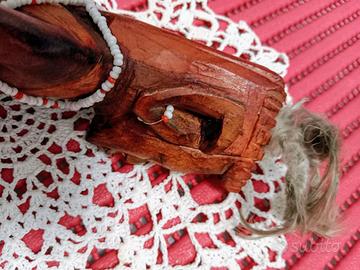 Statuetta di guerriero Masai. La statuetta è in legno intagliato a mano. Ottimo stato. La statuetta è completa di tutti gli accessori: collana di perline bianche e rosse che partono dal collo, si intrecciano sul torace e finiscono in vita, cavigliera di perline e orecchini di perline. La statuetta ha anche "ciuffo capelli". Visionabile e ritirabile in Milano zona Sud o possibilità di spedizione a mezzo subito