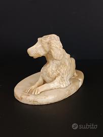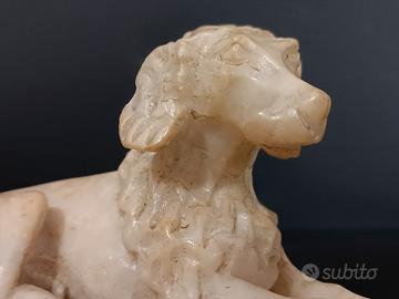 Elegante statuetta francese d'epoca in alabastro, raffigurante un cane di razza Spaniel accucciato.