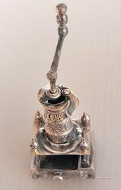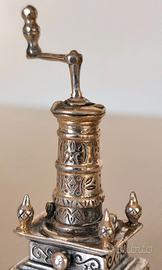 Raffinata macina caffè in Argento 925, un pezzo unico di artigianato italiano. - Realizzata in Argento 925. - Design decorato e dettagliato. - Manovella per la macinatura. Miniatura in Argento 925 Macinino da caffè prodotto in Italia (AR) dalla Medusa Oro In ottime condizioni come da foto Alta 6,5 cm Peso 38 grammi circa