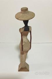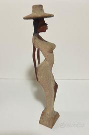 Statuetta scultura in legno astratta di una figura femminile che indossa un cappello a larghe falde . I fianchi e il seno risultano abbondanti. Misure altezza 25 cm .
