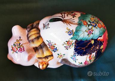 Si tratta di una statuetta di gatto dormiente in porcellana cinese Famille Rose.Questo tipo di porcellana è noto per la sua tavolozza di colori tenui e caldi, che include rosa, gialli e verdi.