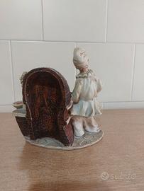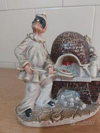 Bellissima statuetta in ceramica raffigurante Pulcinella, il celebre personaggio della tradizione napoletana, accanto a un forno a legna.