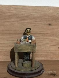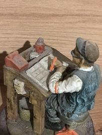 Statuetta da collezione in poliresina raffigurante uno scrivano/contabile al suo banco di lavoro, ricca di dettagli realistici che ne accentuano il carattere, dipinta a mano, marca Collezione Galileo, made in Italy.