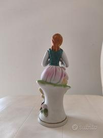 Splendida statuetta vintage in pregiata porcellana stile Capodimonte, raffigurante una giovane fanciulla in abiti rurali con dettagli floreali tra le mani.