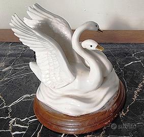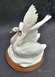 Elegante statuetta in porcellana "Fedeltà del cigno" su supporto in legno