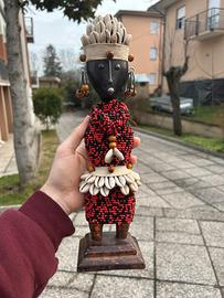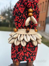 Figura femminile tribale decorata con perline rosse e nere, conchiglie e dettagli in corda