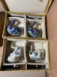 sculture in smalto cloisonné, una tecnica tipica dell’artigianato cinese che prevede l’uso di fili metallici e smalti colorati per creare decorazioni dettagliate su rame o bronzo.