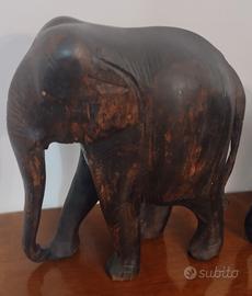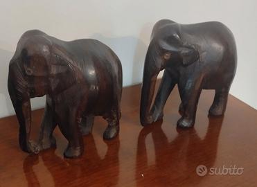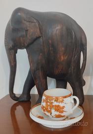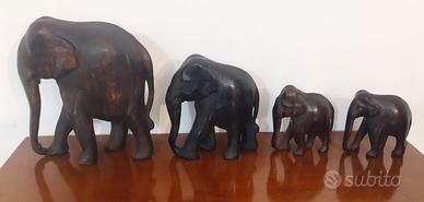 Set di quattro elefanti indiani intagliati a mano vintage, con dimensioni a scalare. Tazzine da caffè inserite in foto per idea proporzioni. Altezze in cm: 21, 15, 11.5, 11.